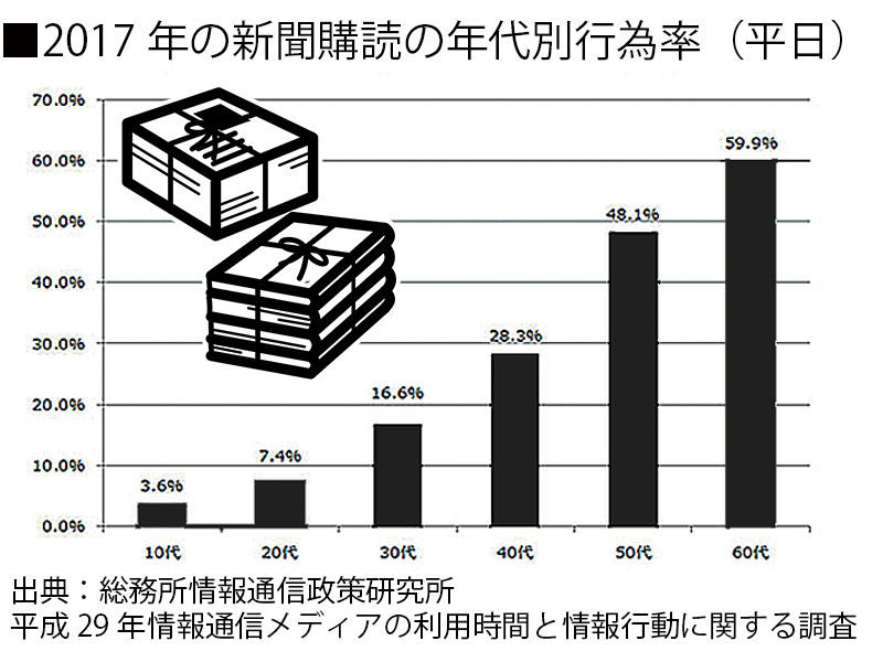 新聞の購読者は高齢者が中心で、主な労働力となる10代~30代の大半は新聞を見ていません。ひらじょぶはポスティングによる配布なので新聞購読に関係なく、全ての世代に閲覧してもらうことが可能です。