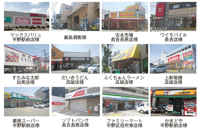 業務スーパー様、イオン長吉店、餃子の王将出戸店、カレーハウスCoCo壱番屋平野瓜破店、共立病院、セブン-イレブン大阪加美南3丁目店、日産大阪販売株式会社平野店、ベルコシティホール平野、ヤマト運輸川辺センター、天下一品喜連瓜破店、POLA喜連瓜破店、てんそう苑、株式会社サトウプロジェクト、POLA喜連瓜破店、メナード喜連瓜破店、チェリッシュインターナショナルスクール、クリブヘアー、ヘアーズクー、介護のオアシスグループ、ケアプランセンターここいろ、毎日新聞長吉販売所、読売大阪南販売