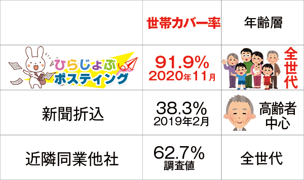 端的に言えば、ひらじょぶを配るついでに御社のチラシも配る形になるので、安く、高いカバー率で配布可能になっています。新聞折込は世帯カバー率も